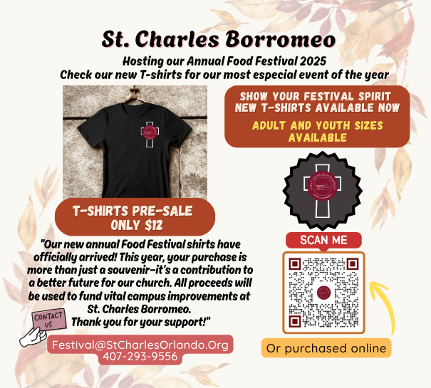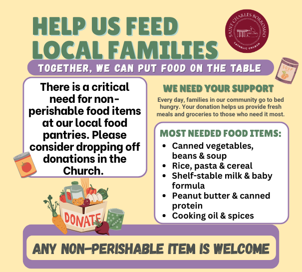 We, the members of St Charles Borromeo Catholic Church, are committed to responding to God’s call to become one body in Christ, through the celebration of the sacraments, education, faith formation and community outreach. We embrace the commandments of loving God and neighbor in our love, fellowship, and support for all God’s people.