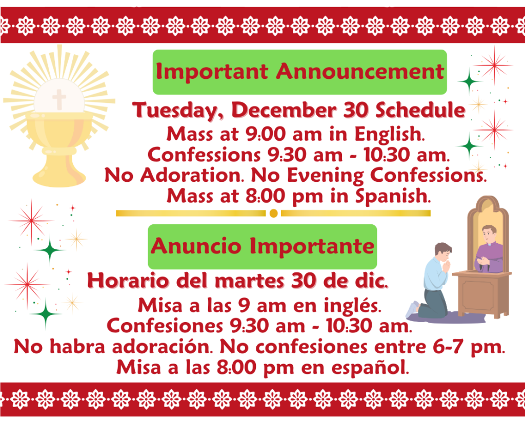 No adoration on Tuesday 12/30 – No adoración el 12/30